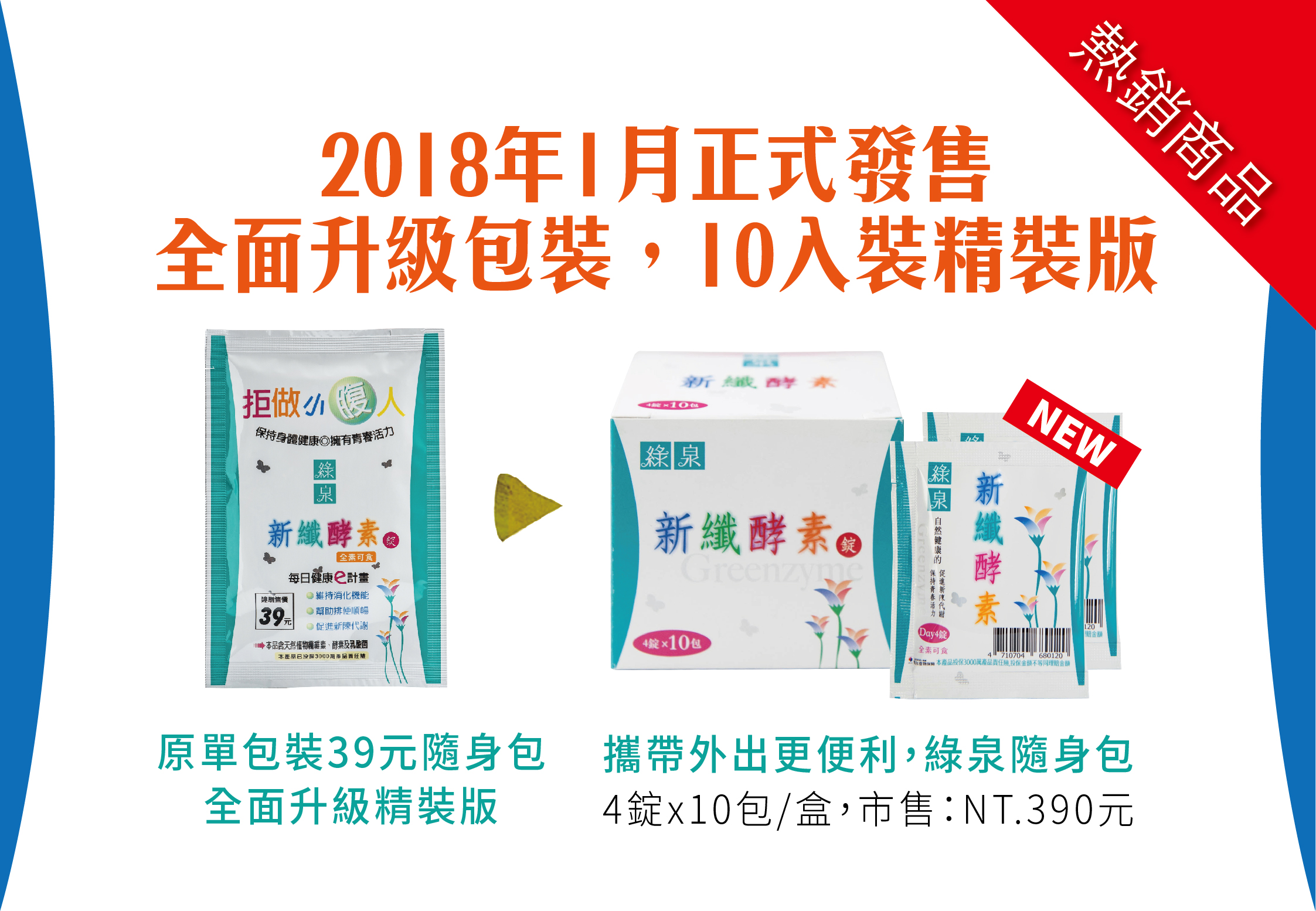 即日起,綠泉新纖酵素隨身包產品之產品包裝內容升級變更為精裝盒裝版,內容量為10入包裝。