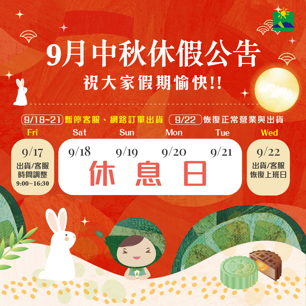9/18~9/21中秋連假暫停客服、網路訂單出貨公告