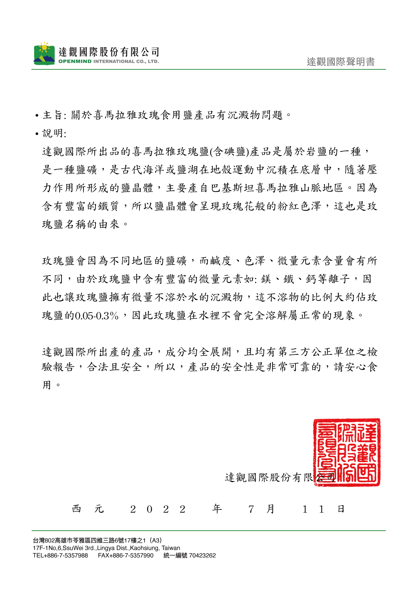 達觀國際喜馬拉雅玫瑰鹽(含碘鹽)產品之聲明,詳情公告